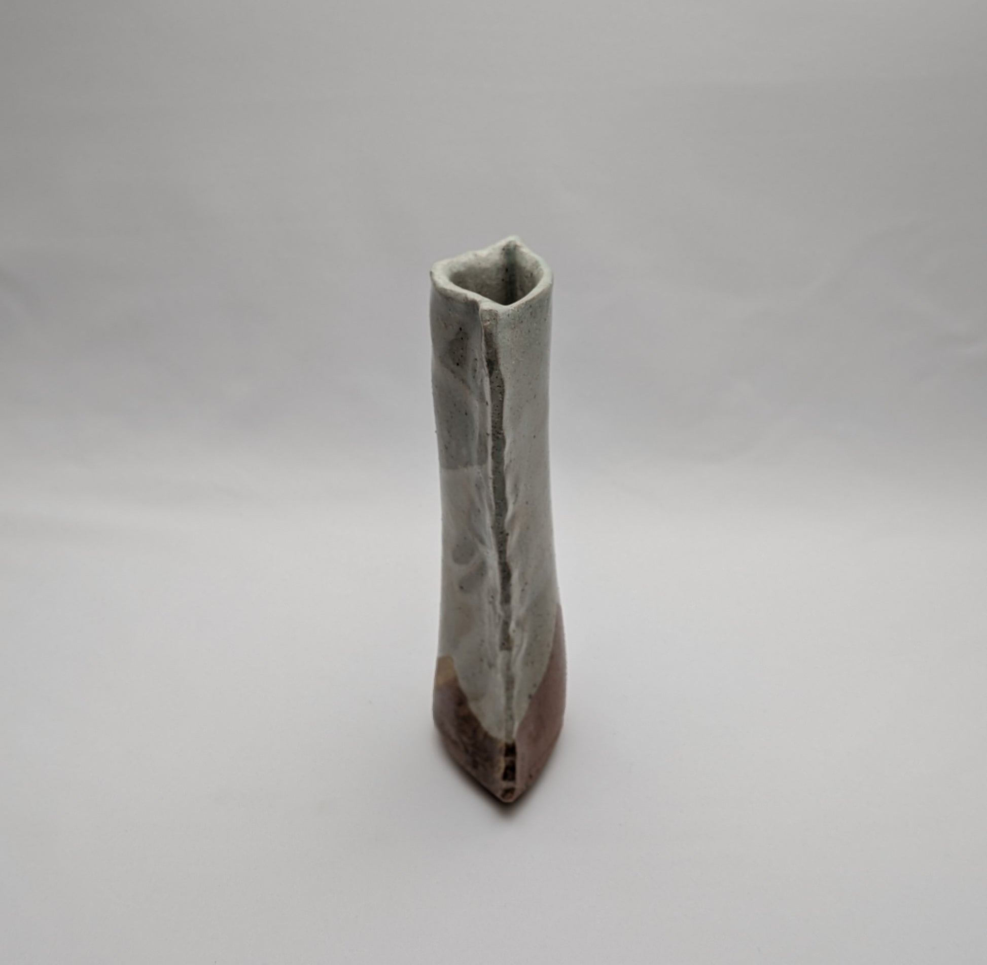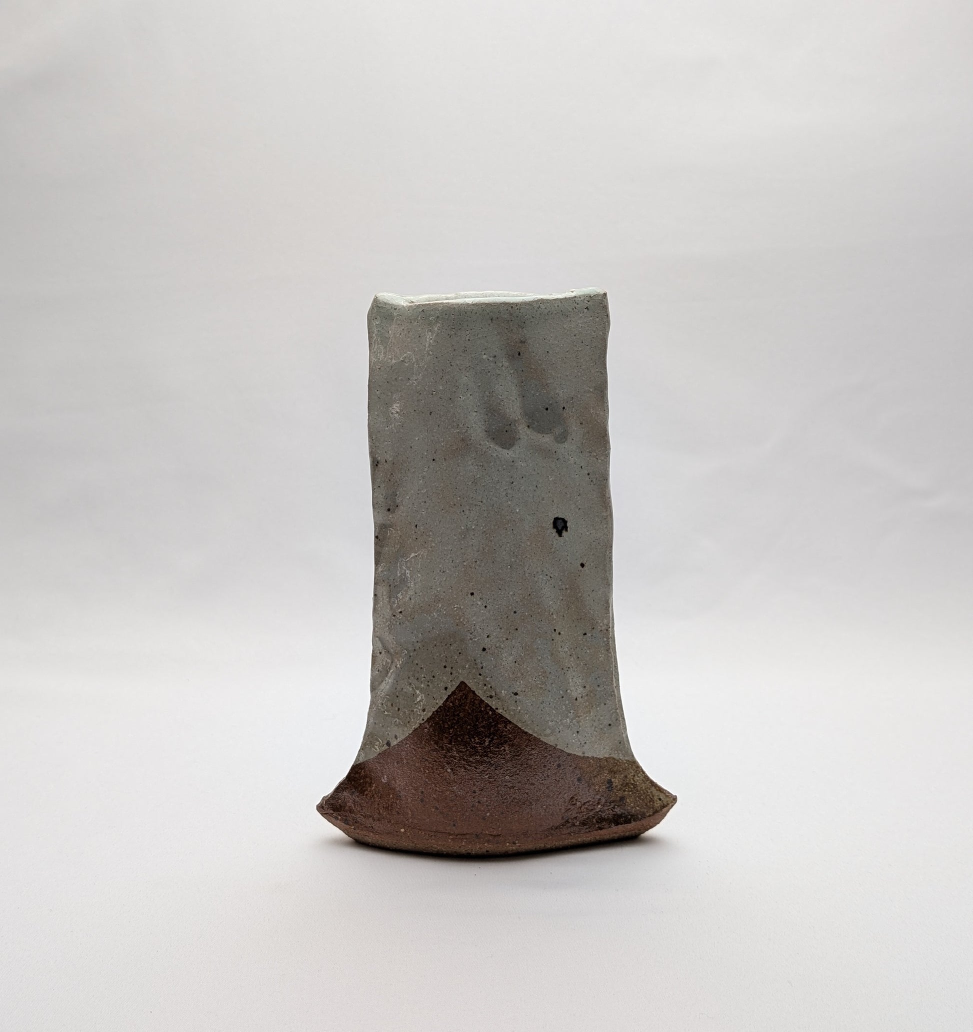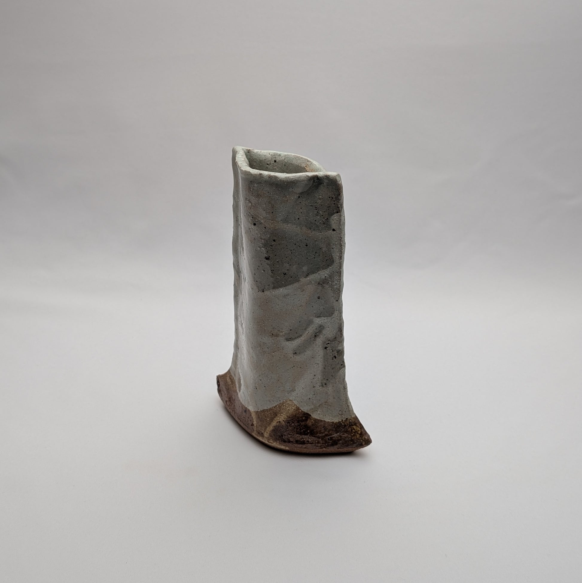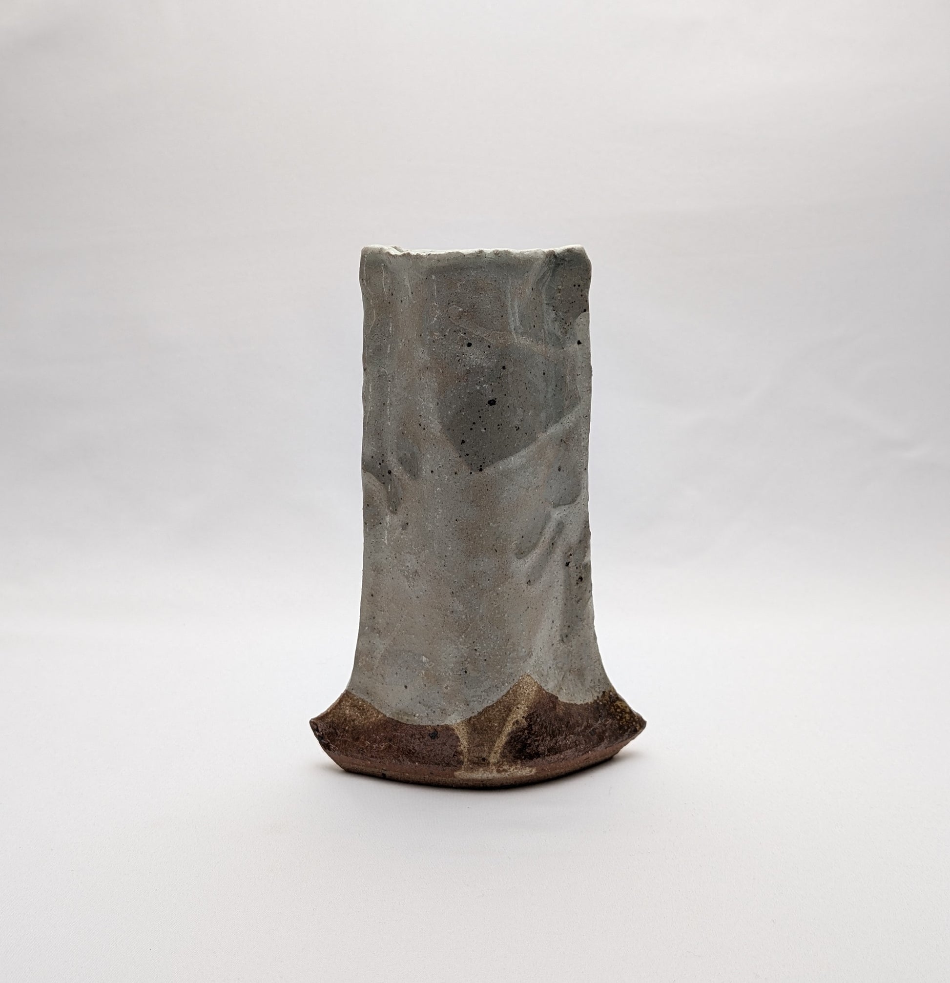 Ce vase artisanal de Tokoname présente une silhouette légèrement évasée vers la base, offrant une impression de stabilité tout en conservant un mouvement subtil dans la ligne.
